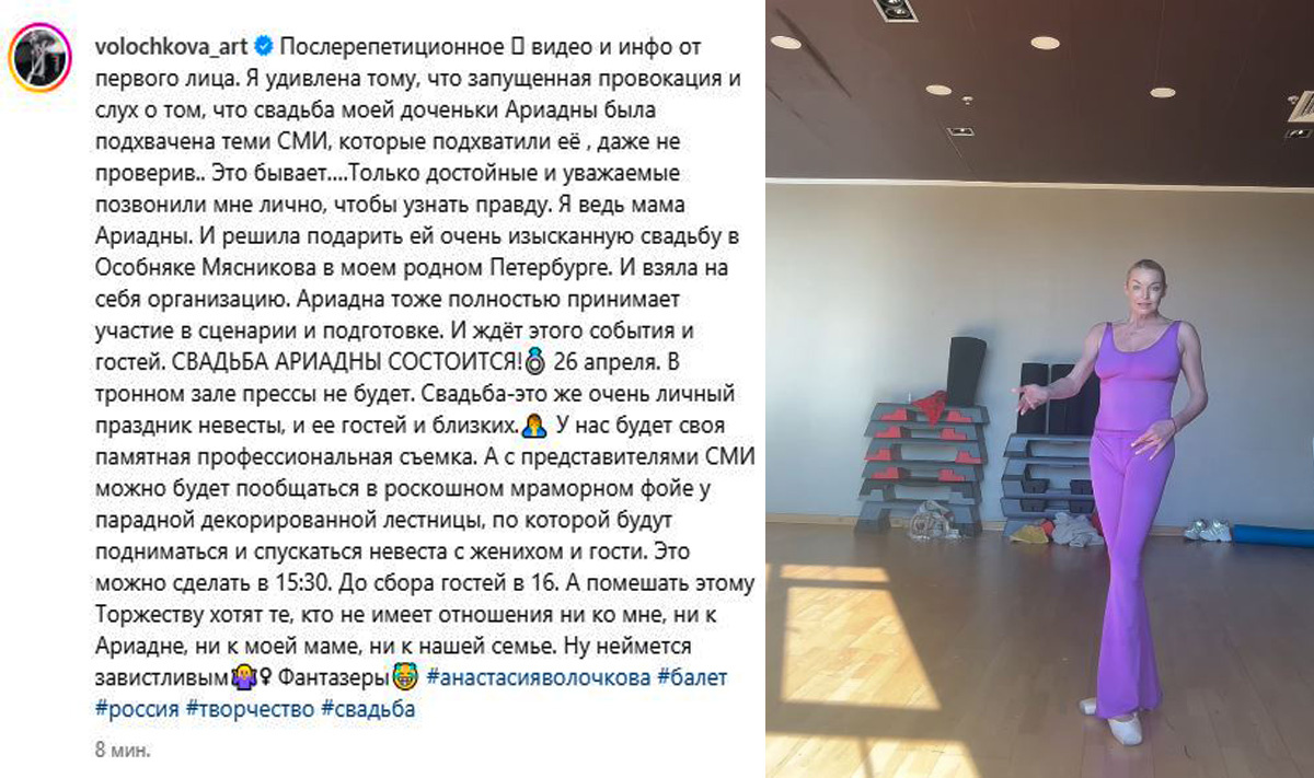 Не успели мы переварить все шпагаты и интриги, как вдруг – новое "важное заявление"! На сей раз повод вроде бы серьезный – свадьба дочери Ариадны. И поначалу информация выглядела драматично: торжество, намеченное на 26 апреля, якобы отменяется! Представляете масштаб трагедии? Интернет-сообщество замерло в ожидании... или нет? Вот тут-то и начинается самое интересное.