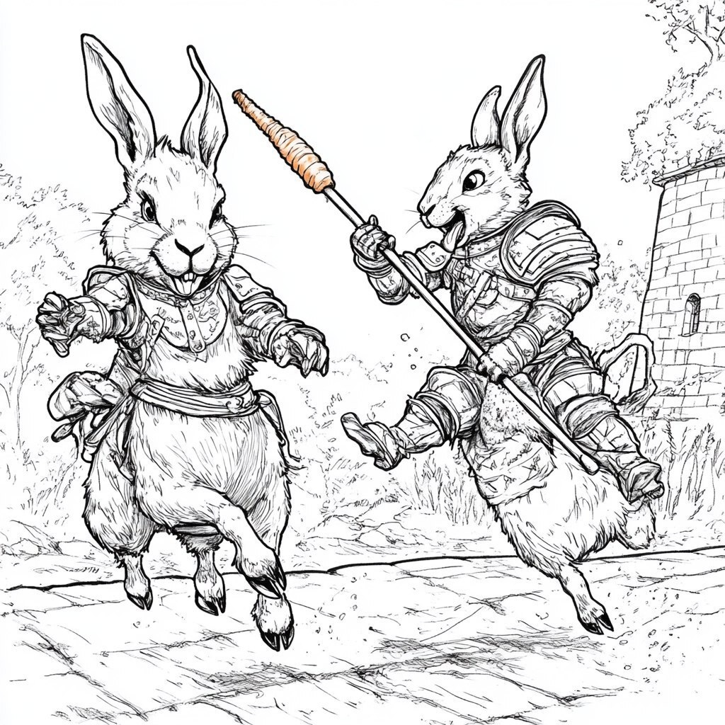Создано на основе запроса: Coloring page for kids. A hare dressed in white knight’s armor, riding a goat, is participating in a medieval knight’s tournament. The hare is holding a tournament lance made of a carrot. Racing toward him is another hare on a goat, but clad in dark armor