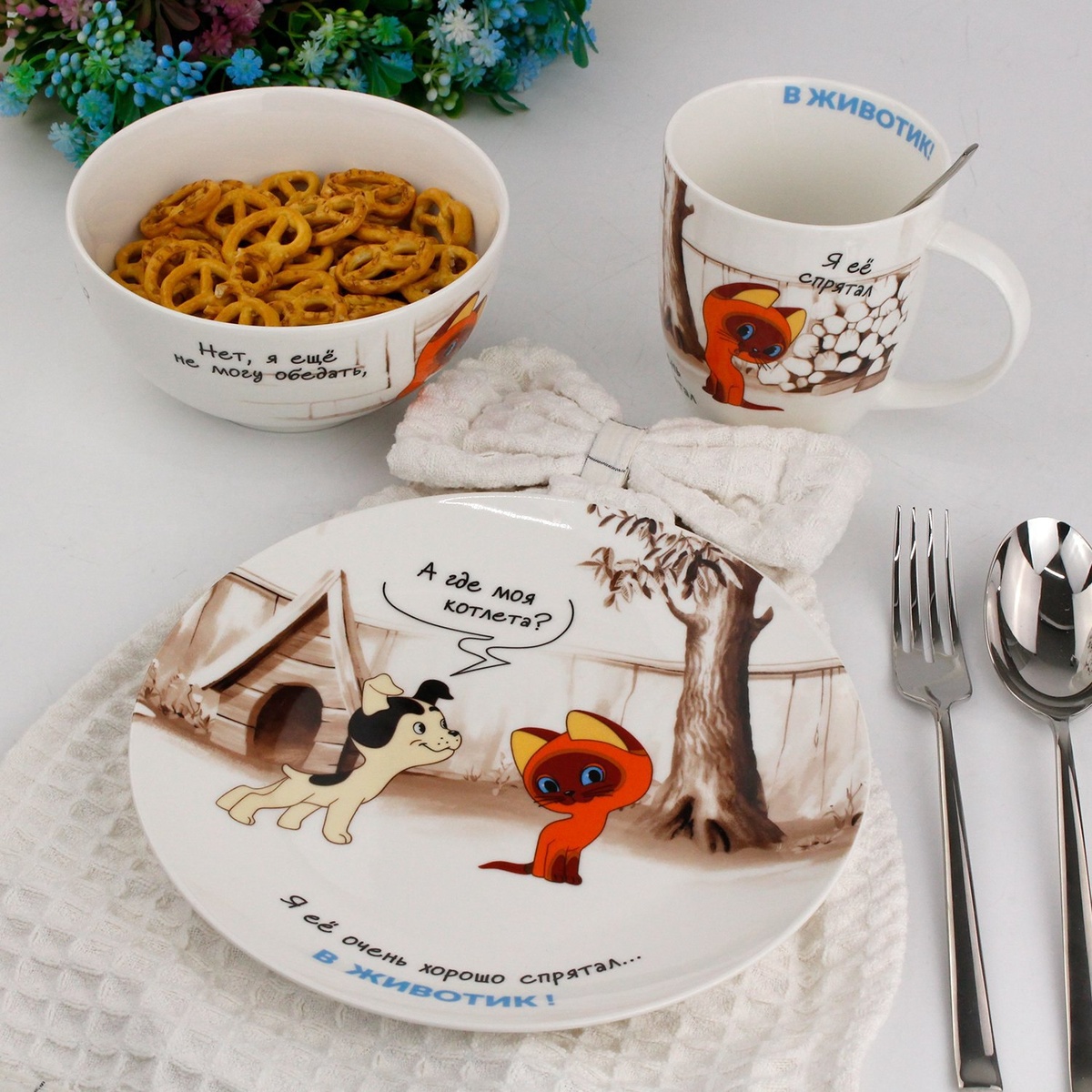 Знакомые с детства герои вновь обретают жизнь в коллекции посуды по мотивам мультфильма "Котенок Гав"! Каждая тарелка и кружка — это