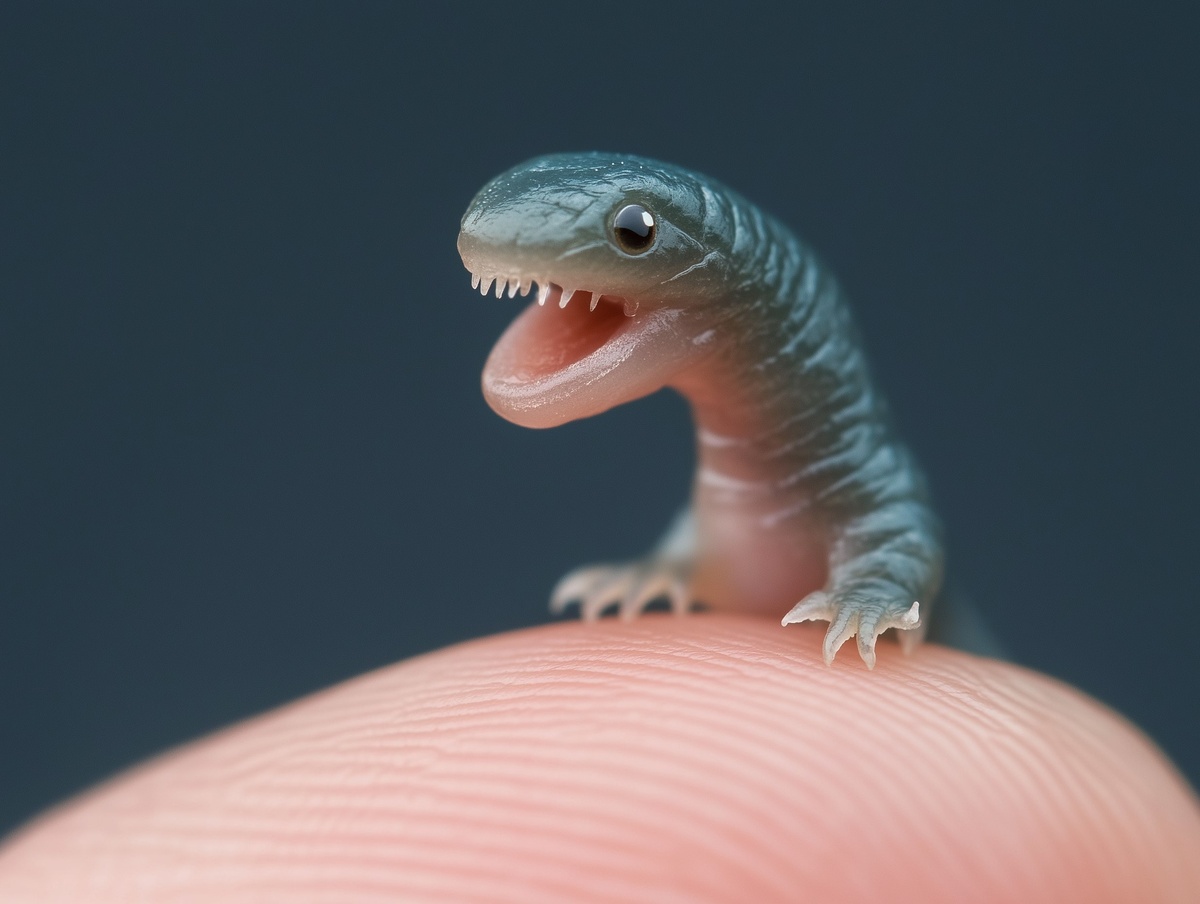 Создано на основе запроса: miniature Loch Ness Monster or leach on the tip of her finger