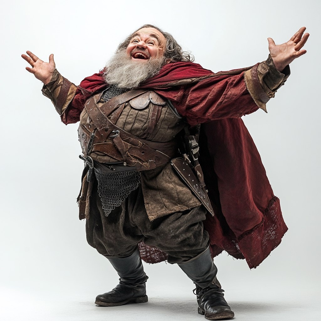 Создано на основе запроса: photo of a drunk dwarf laughing and gesturing, dressed in medival clothes, heavy leather shoes and cape, side