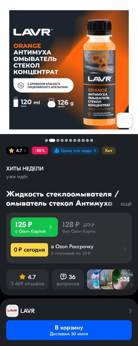 Всем привет 👋👋 Очень уж понравились мне очистители следов от насекомых, поэтому решил прикупить себе концентрат, чтобы очищать лобовое прямо в пути 🤭🤭 Вдобавок, он выходит дешевле, чем покупать готовую фиг пойми какую летнюю омывайку ❗Покупал конечно же на Ozon: