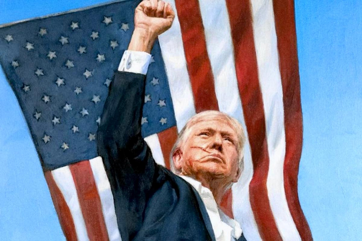 Картина изображает Трампа на фоне звёздно-полосатого флага с символическими элементами: орлом, книгой и скрещёнными пальцами — деталь, которую интерпретаторы уже