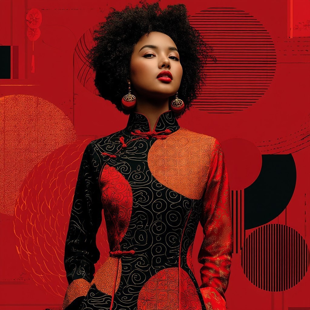 Создано на основе запроса: A woman with an afro, wearing red lipstick and a Chinese-inspired dress in the style of dark crimson and black