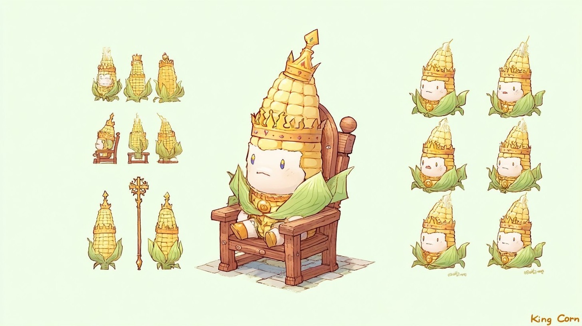 Создано на основе запроса: character sheet for a corn-cob character, showing all emotions, all expressions, all positions: "King Corn