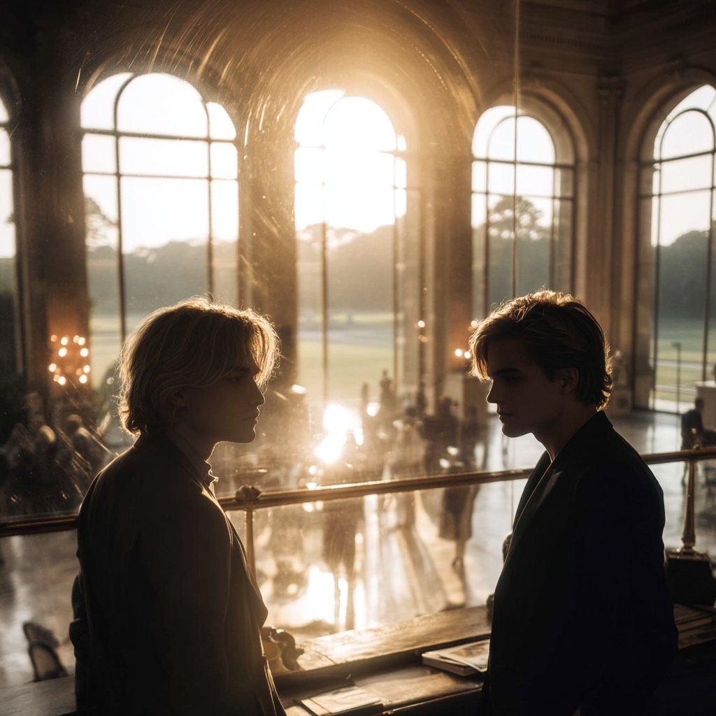 Создано на основе запроса: 2 college age male royals with dark blond mop hairstyles, posing for a picture, aesthetics inside the grand hall