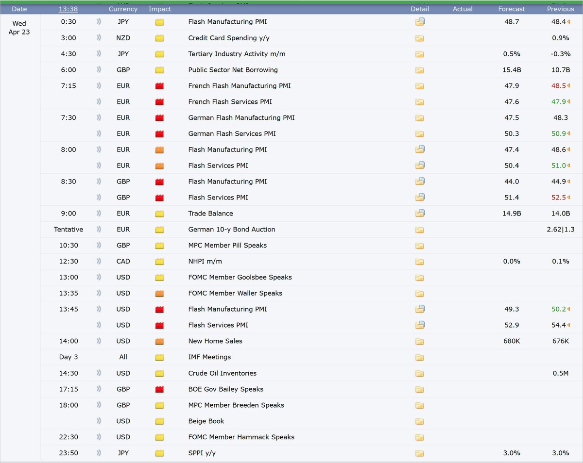 Доброго вечера, уважаемые подписчики канала и коллеги трейдеры. Представляю Вашему вниманию экономический календарь на среду, 23 апреля. На пред маркете Лондонской сессии нас ожидает серия публикаций предварительных данных PMI - ожидается снижение показателей по всем фронтам. Возможны и вербальные факторы влияния. ❗️Обратите внимание❗️ 👉🏻 Время выхода новостей указано по UTC 🔍 Актуальные ссылки на вебинары авторского курса 🧐 Регистрация ЛК в новостном аналитическом портале 🖥️Записи обзоров и вебинаров доступны на площадках: 🟣ТГ (чат) 🟣Дзен 🟣RuTube 🟣ВК 🟣YouTube #календарь