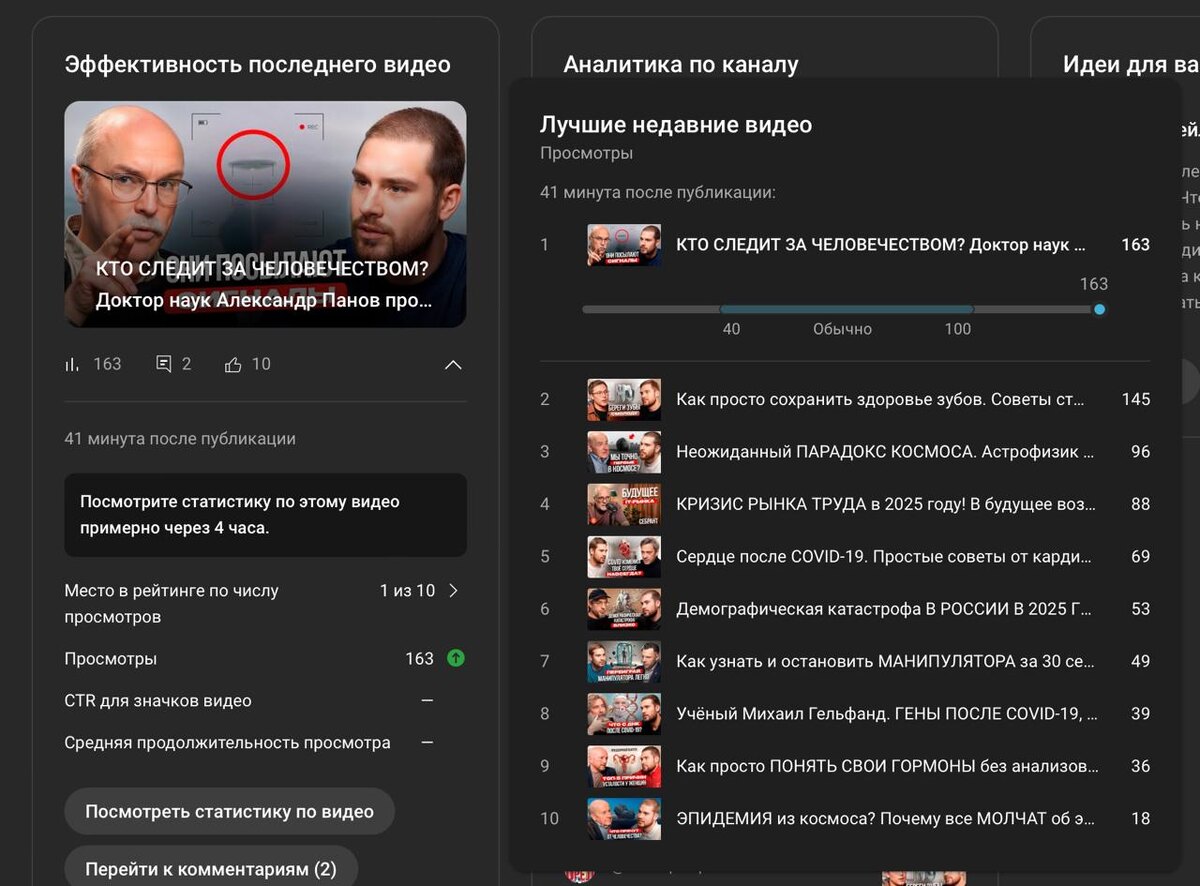 Ютуб хорошо встретил новое видео. 160 просмотров за 40 минут Интересно, что будет дальше, так как ютуб очень не предсказуемый для меня Прошлое видео за ночь набрало 5 тысяч просмотров, стало лидером, а за 11 дней набрало 20 тысяч просмотров, что неплохо, но рост замедлился практически сразу Хотя у меня на канале есть кейс, когда видео спустя месяц начало расти