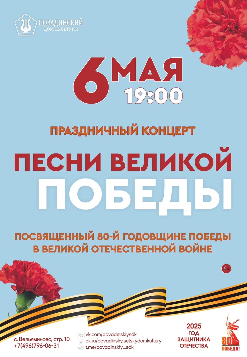 ✨ 🪖Приближается великий праздник «со слезами на глазах» - День Победы. Мы приглашаем всех желающих на праздничный концерт, посвящённый 80-й годовщине Победы в Великой Отечественной войне, «Песни Великой Победы». Давайте вместе вспомним страшную главу истории нашей страны и почтим память всех, кто внес вклад в борьбу с врагом🪖 🚫 Возраст: 6+ 📆 06.05.2025🕒19:00 🏢 Повадинский сельский дом культуры (СДК) 📍 г.о.Домодедово, с.Вельяминово, 10, Центральная площадь ✅ Мероприятия Домодедово https://dzen.ru/id/66f10385cc4c5a16f7b5fb02 http://vk.com/domodedovo_events http://dzen.ru/domodedovo_events