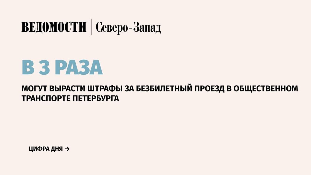 Губернатор Санкт-Петербурга Александр Беглов внес на рассмотрение Законодательного собрания города законопроект, который увеличит штрафы за неоплату проезда в общественном транспорте. Сумма штрафа может вырасти в три раза – с 500 до 1500 руб. ⚪️Штраф в 1500 руб. будет применяться как к нарушителю, так и к каждому безбилетному ребенку, который с ним находится. Если пассажир не сможет подтвердить право на бесплатный или льготный проезд, штраф составит 1000 руб. Столько же придется заплатить за неоплаченный багаж. ⚪️Количество выявленных безбилетников в городе значительно возросло. Так, в 2021-2022 гг. число протоколов об административном правонарушении составило 3800, в 2023 г. – 11 120, а в 2024 г. – 14 731. 📰 Подпишитесь на «Ведомости Северо-Запад»