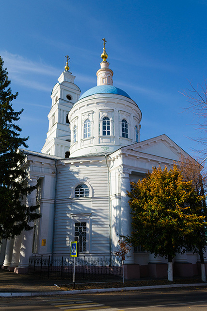 «С трех сторон храм украшают и придают грандиозность зданию колонны. С восточной, алтарной стороны колоннада примыкает к стене. Красиво выглядят фронтоны, портики, украшенные резным карнизом. Кровля купола была украшена золотыми небесными звездами. Украшают храм, в отличие от других церквей, сверкающие позолотой барабан и луковка с крестом. С западной стороны храма возвышается красавица-колокольня, к стенам которой примыкают полуколонны», – так описывается церковь на сайте Курской епархии.