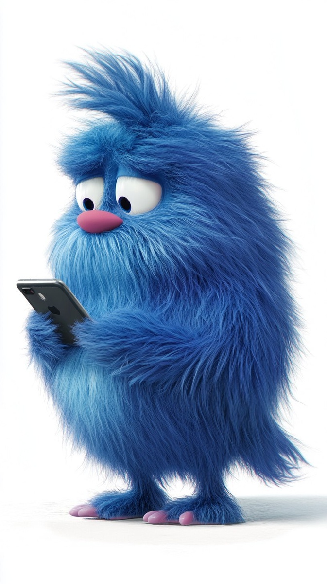Создано на основе запроса: A blue, fluffy creature with long fur and pink lips, standing on its hind legs in the style of Pixar animation, appears deeply emotional and nostalgic. Its vibrant fur contrasts sharply against the stark white background. The creature is holding a phone, rereading old messages and scrolling through photos, its gaze filled with longing and sorrow. It conveys a sense of heartbreak and yearning, convinced it still needs the loved one who left. The posture, expression, and scene evoke a bittersweet and tender moment while maintaining the whimsical yet emotional focus on the character. --- Автоперевод: Голубое, пушистое существо с длинным мехом и розовыми губами, стоящее на задних ногах в стиле анимации Pixar, кажется глубоко эмоциональным и ностальгическим. Классно выглядит? 🤔 https://dzen.ru/id/65c0c65c86e4f837c27b24d7 #ИИ #AI #нейросеть #midjourney #art
