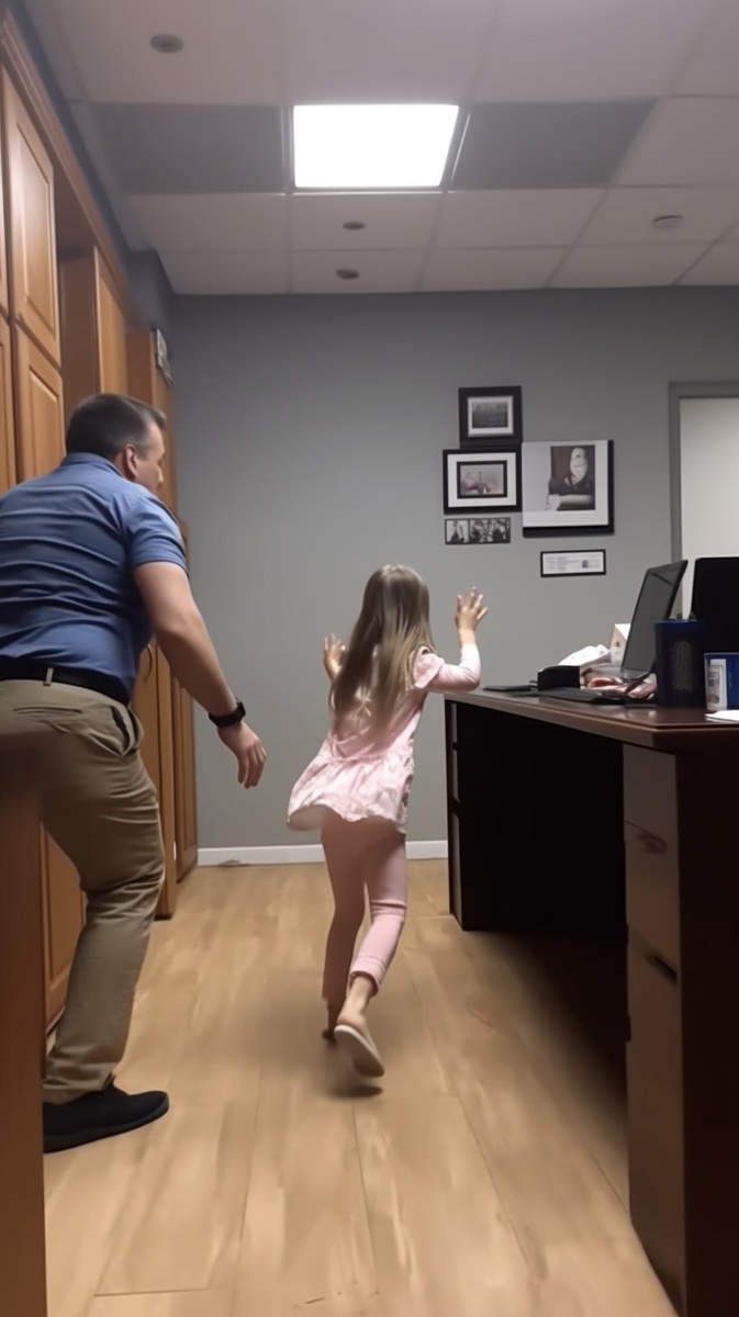 Создано на основе запроса: The girl running toward her father sitting at a desk on a Zoom call, waving her away without looking, laptop