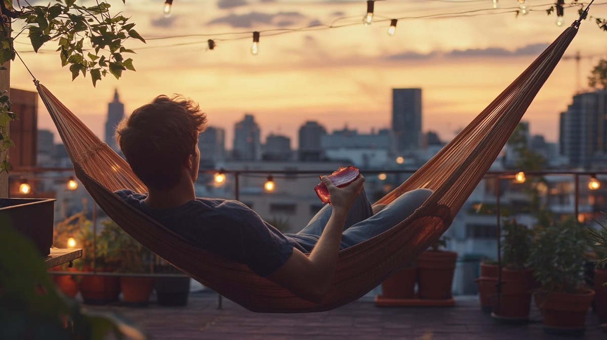 Создано на основе запроса: A relaxed urban rooftop setting at sunset or twilight. A young man is lying comfortably in a hammock stretched between two poles or rooftop structures. He’s casually dressed, enjoying a peaceful moment above the city. In one hand, he holds a slice of cooked ham , about to eat it or already taking a bite. The ham is clearly visible, soft and appetizing, catching the warm light of the golden hour. Around him, you can see elements of the rooftop: potted plants, string lights, and a partial skyline with buildings in the background. The atmosphere is calm, modern, and slightly dreamy a quiet escape in the middle of the city, with food as part of the comfort. --- Автоперевод: Расслабленная городская крыша на закате или сумерки. Отлично получилось? 🤔 https://dzen.ru/id/65c0c65c86e4f837c27b24d7 #ИИ #AI #нейросеть #midjourney #art