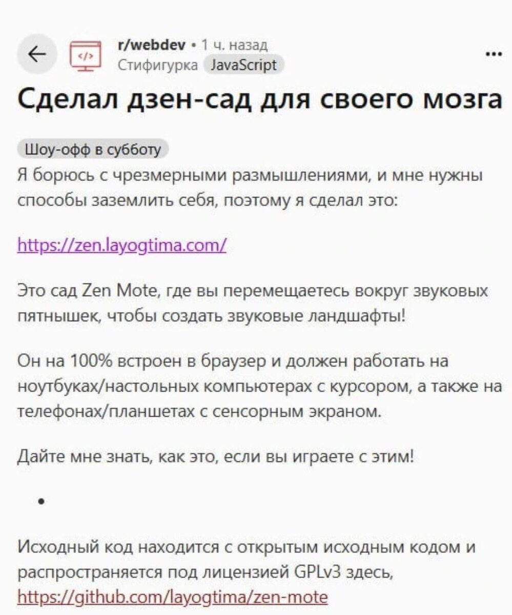 Клевый нейросетевой релаксант! Спасаемся от тревожности и успокаиваем нервы… . Один парень сделал «дзен-сад», который разгружает мозг и возвращает потерянный фокус на задаче. • Генерит звуковой ландшафт, который восстанавливает психику. • Инструкция простая - достаточно водить по экрану пальцем. • Работает прямо в браузере на ПК и смарфоне. . Расчудесная фишка 🤗😍 🔗 zen.layogtima.com