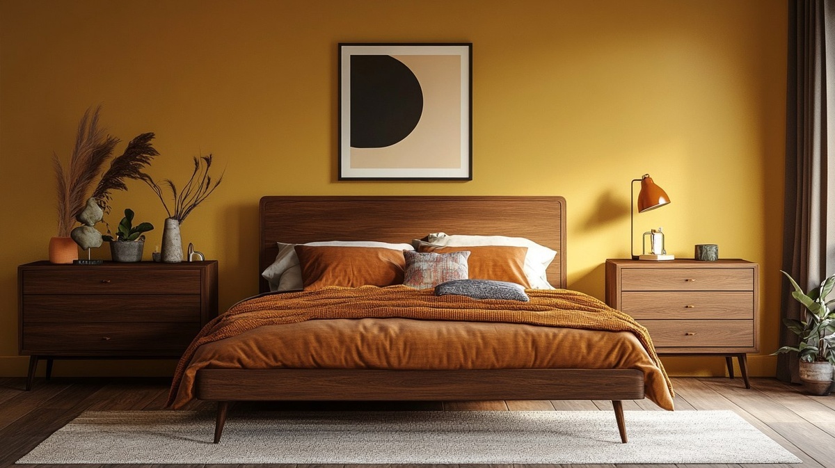 Создано на основе запроса: A mid-century loft bedroom with mustard walls, burnt orange accents, walnut dressers, and a wall behind the bed
