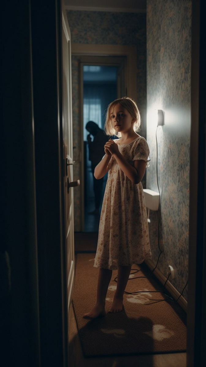 Создано на основе запроса: Girl walking into her mother’s room, weak and desperate, mom talking loudly on the phone, back turned, child