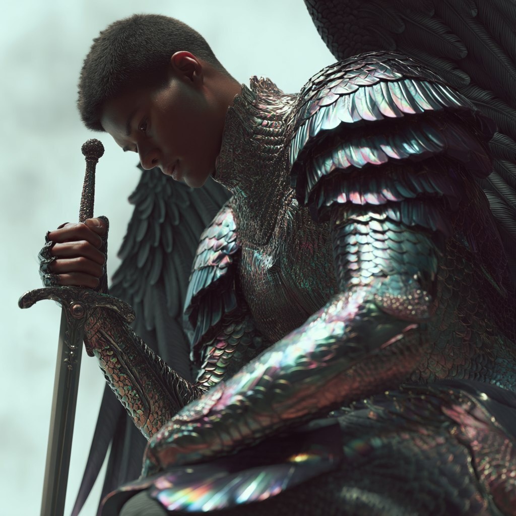 Создано на основе запроса: a fierce male angel with black wings, wearing iridescent armor made from the scales of the Loch Ness Monster, holding a sword, celestial glow, fierce, overcast