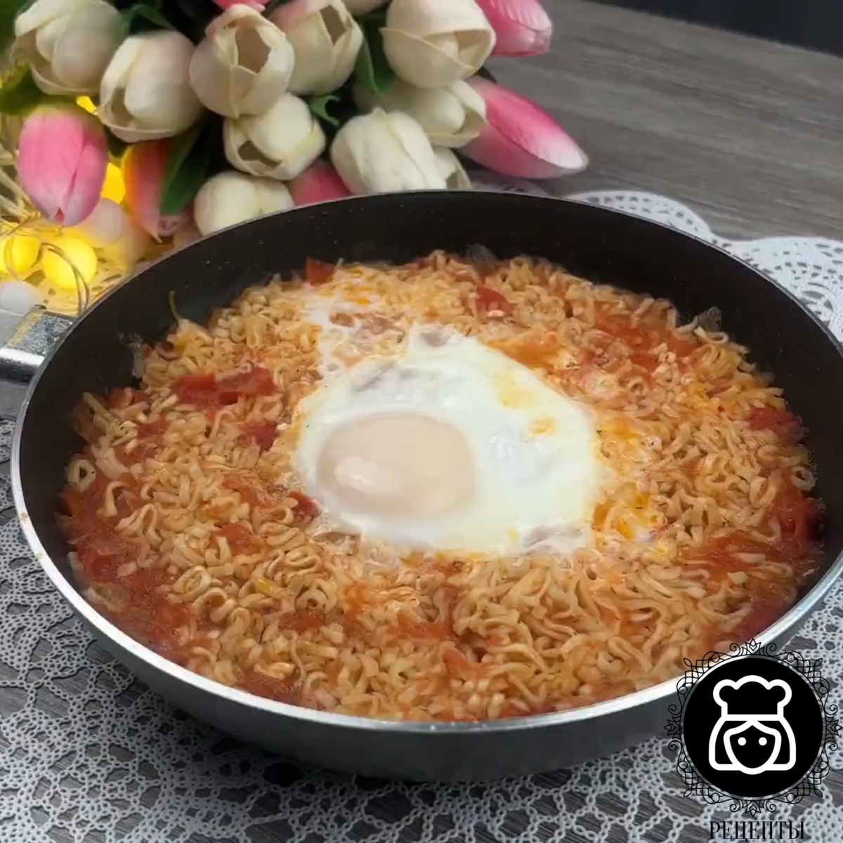 Рамэн с помидорами, луком и яйцами