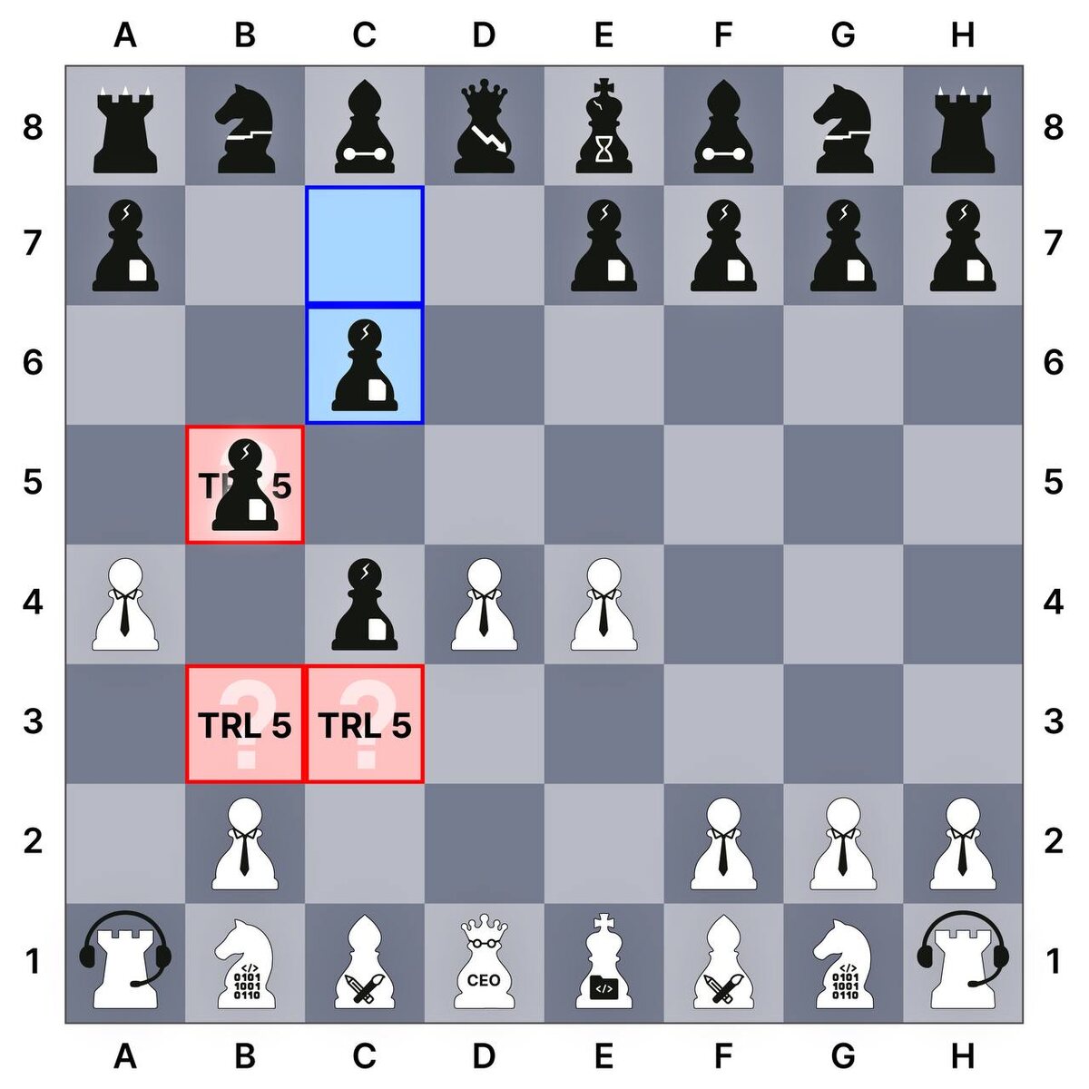 ♟️Патентные шахматы: новый ход 🔜 Ход чёрных: c6 Чёрные укрепляют свою пешечную цепь, подводя поддержку к b5. Теперь их структура выглядит жёстче: пешка c6 защищает b5, которая, в свою очередь, держит c4. Однако за это приходится платить: - Замедленное развитие – чёрные всё ещё не вывели ни одной фигуры. - Ослабленные поля – d6 и b6 становятся уязвимыми. - Новая мишень – пешка c6 сама может оказаться под ударом. 📈 Положение в стартапе: Конкурент, вместо контратаки, усиливает оборону – например, подаёт дополнительную патентную заявку или привлекает юристов для защиты. Это делает его систему менее гибкой, но пока не решает главной проблемы: у стартапа остаётся инициатива и сильный центр. ⭐️ Варианты ответа белых: 1️⃣ b3 – Симметричное усиление Укрепление симметрично усилиям конкурентов для улучшения собственной позиции в случае прямого противостояния (например, дополнительными патентными заявками, сертификацией, поддержкой в медиа) 2️⃣ Nc3 – Доработки Расширение и