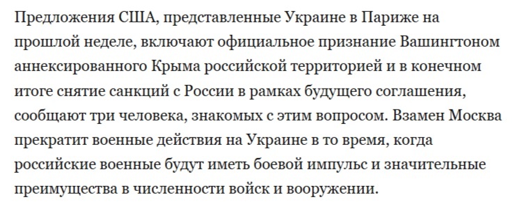 В среду в Лондоне американцы встретятся с троицей «союзников», чтобы обсудить предложения, которые позволят выйти на прямую для завершения конфликта. Однако, загвоздка в том, что там есть такие предложения, которые троице однозначно могут не понравиться. «Вашингтон пост» выпустили статью с «инсайдами» из высших кабинетов, что в среду Штаты предложат троице признать Крым за Россией, а также заморозку линии соприкосновения. В прошлую среду, по утверждению этого же издания, было сообщено следующее: Те же западные чиновники в анонимных беседах рассказывают, что США очень сильно давят, чтобы их предложения были приняты. А когда переговорщика спросили, так ли это, то там ответили в таком русле: Иронично, что как только эти неофициальные заявления о признании Крыма вышли в публичное поле, нелегитимный поспешил заявить, что этого никогда не будет. И что-то там ещё снова про гарантии… В итоге, сейчас складывается такая ситуация: Мы уже описывали наше видение ситуации, когда США умывают руки. Вк