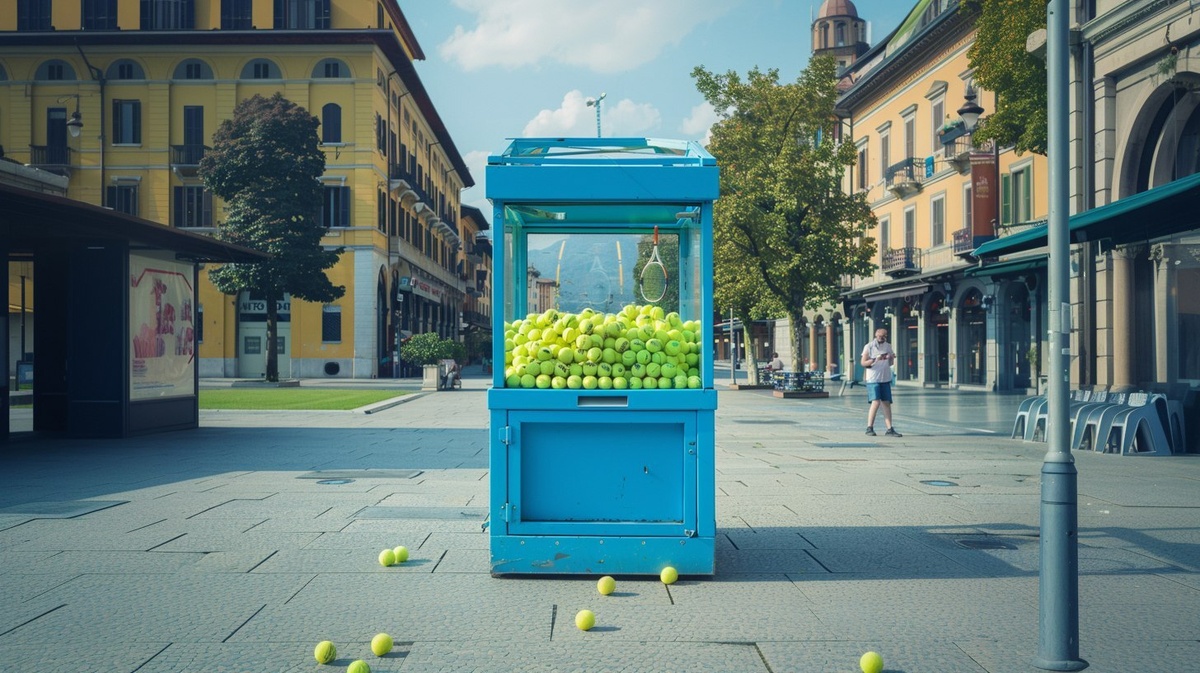 Создано на основе запроса: hd image of a blue grab machine with lots of tennis balls inside in a square in turin