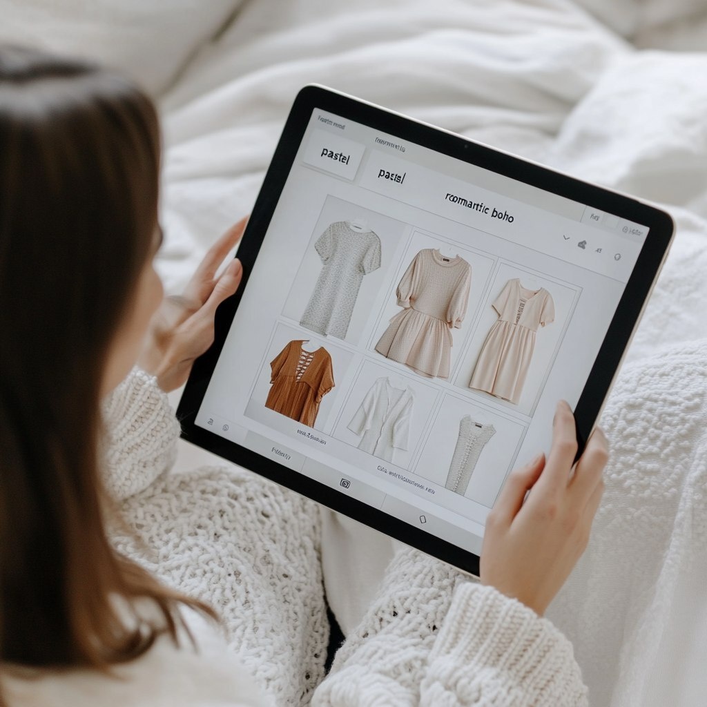 Создано на основе запроса: A stylish young user browsing a fashion e-commerce website on a tablet, entering keywords like "romantic pastel