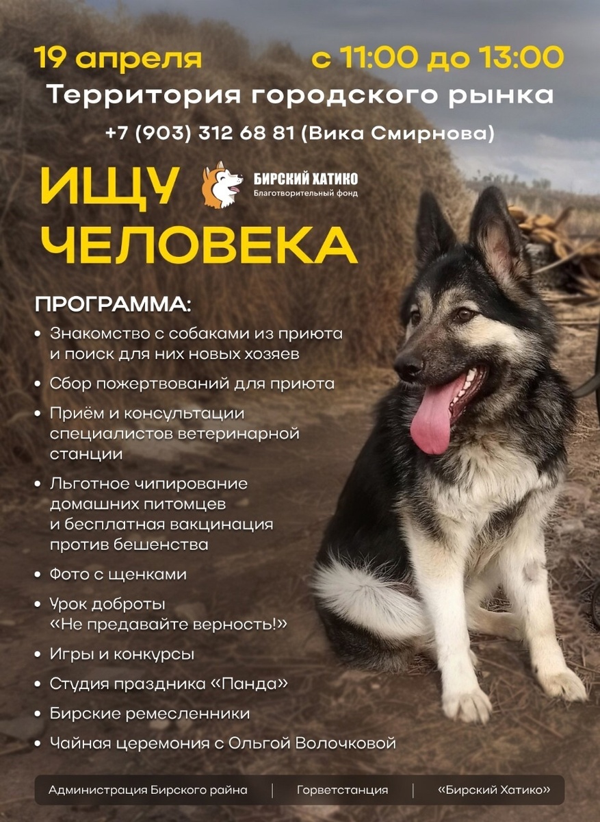 19 апреля с 11 до 13 часов на торговой площади городского рынка в Бирске пройдет благотворительная акция «Ищу человека», направленная на помощь бездомным собакам.