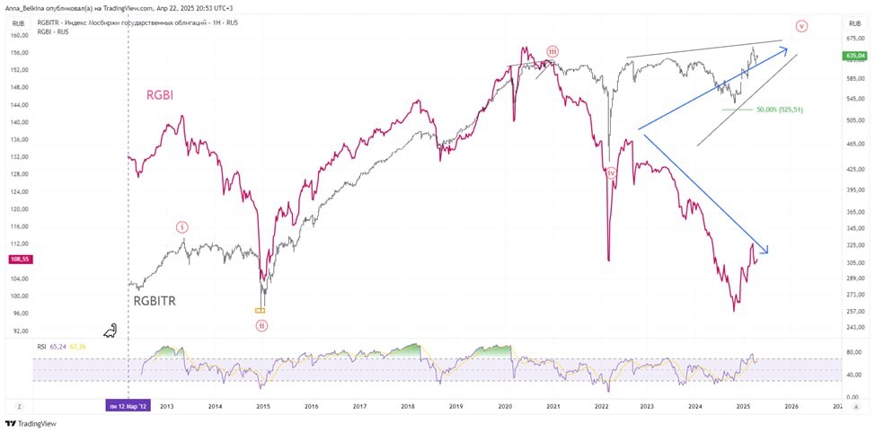 #RGBI #RGBITR Часть 2 Сейчас перейдем к технике. 1. Если провести сравнительный анализ, то мы видим, что поведение двух индексов по экстремумам практически идентично с явным расхождением после начал СВО, где RGBITR продолжал расти за счет купонной доходности, а RGBI (лишенный этой «поддержки») пошел вниз. С тех пор процентная ставка «взлетела» до 21%, долговой рынок рухнул.. что уж говорить, дисконт по ОФЗ достигал 50%+ , и до сих пор бумаги с дальней дюрацией торгуются с существенным дисконтом. Это наглядно показывает поведение участников рынка через RGBI, где цены на ОФЗ снижались на растущей ставке. Продолжение 👇 Не является ИИР