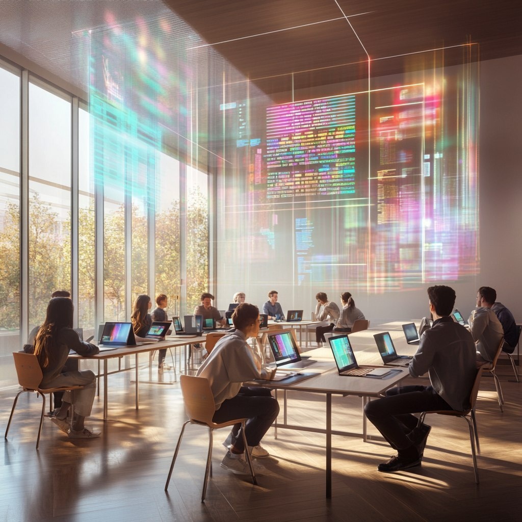 Создано на основе запроса: A vibrant, photorealistic scene inside a modern Spanish classroom at Nuclio Digital School: diverse adult students interact with laptops while a translucent holographic AI assistant projects colourful code snippets and data visualisations into the air; bright natural light floods the room, sleek contemporary décor, energetic and motivational atmosphere, ultra-detailed 4K render. --- Автоперевод: Яркая, фотореалистическая сцена в современном испанском классе в Nuclio Digital School: разнообразные взрослые учащиеся взаимодействуют с ноутбуками, в то время как полупрозрачные голографические помощники AI проектируют красочные фрагменты кода и визуализации данных в воздух; Как тебе иллюстрация? 🤔 https://dzen.ru/id/65c0c65c86e4f837c27b24d7 #ИИ #AI #нейросеть #midjourney #art