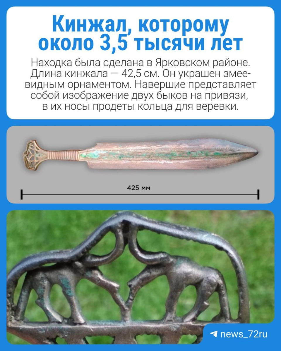 В Ярковском районе нашли кинжал, который изготовили в XV–XIV веках до нашей эры. Экстерьер животных с массивными дуговидными рогами позволяет археологам увидеть аналогии с изображениями быков на рельефах древнего Шумера <...>. Есть скобка над головами животных. Такой компонент в изделиях сейминско-турбинского феномена встречается впервые, — рассказывают археологи. 🗯 Сейминско-турбинский транскультурный феномен — это специфические бронзовые находки, которые обнаруживают в Евразии. Они датируются 2150–1600 годами до нашей эры.