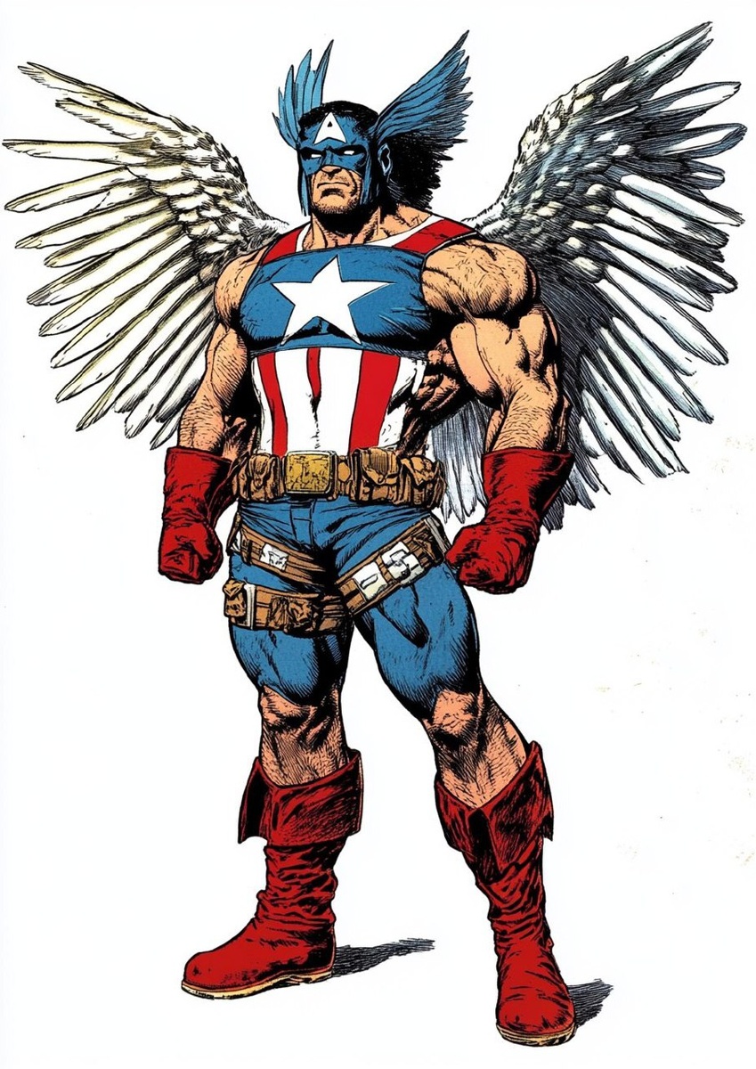 Создано на основе запроса: Show Full Body Image of 1970s-1980s Patriotic Superhero with Wings, Very Muscular and Tough, Red White and Blue, Public Domain Superhero Captain Battle meets Hawkman, style of John Byrne and George Perez, --- Автоперевод: Покажите полный образ тела 1970-х годов патриотического супергероя с крыльями, очень мускулистые и жесткие, красно-белые и синие, общественное супергероя капитан битва встречается с Хокманом, стиль Джона Бирна и Джорджа Переса, Круто вышло? 🤔 https://dzen.ru/id/65c0c65c86e4f837c27b24d7 #ИИ #AI #нейросеть #midjourney #art