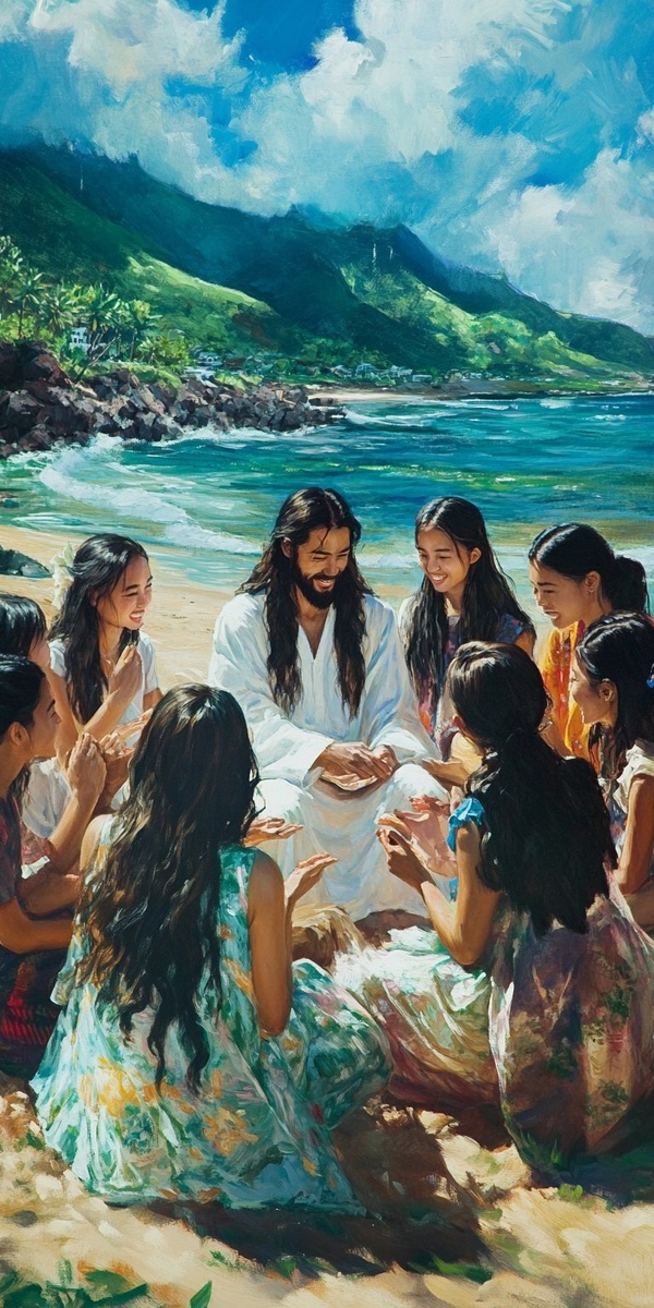 Создано на основе запроса: surrounded by happy Asian pacific female and male college students on the Hawaiian coast, Jesus mentors them