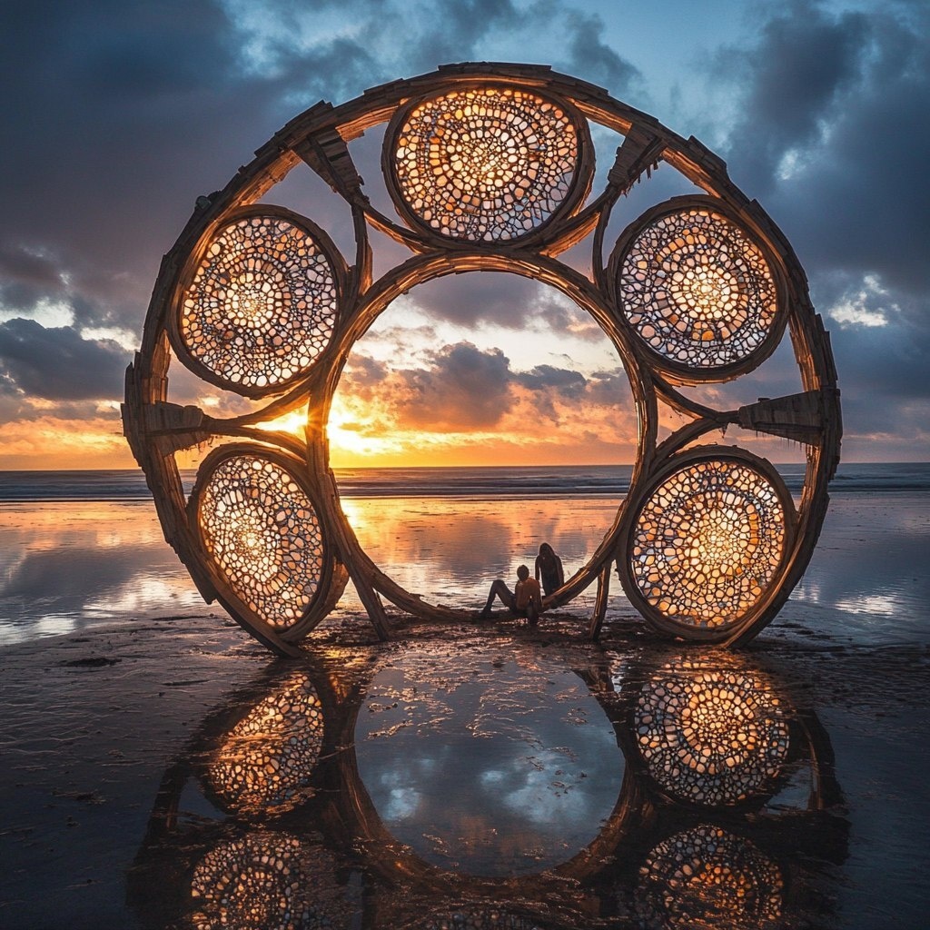 Создано на основе запроса: weird architecture wheels and portals made of wood on beach everything is reflecting and there are intricate old
