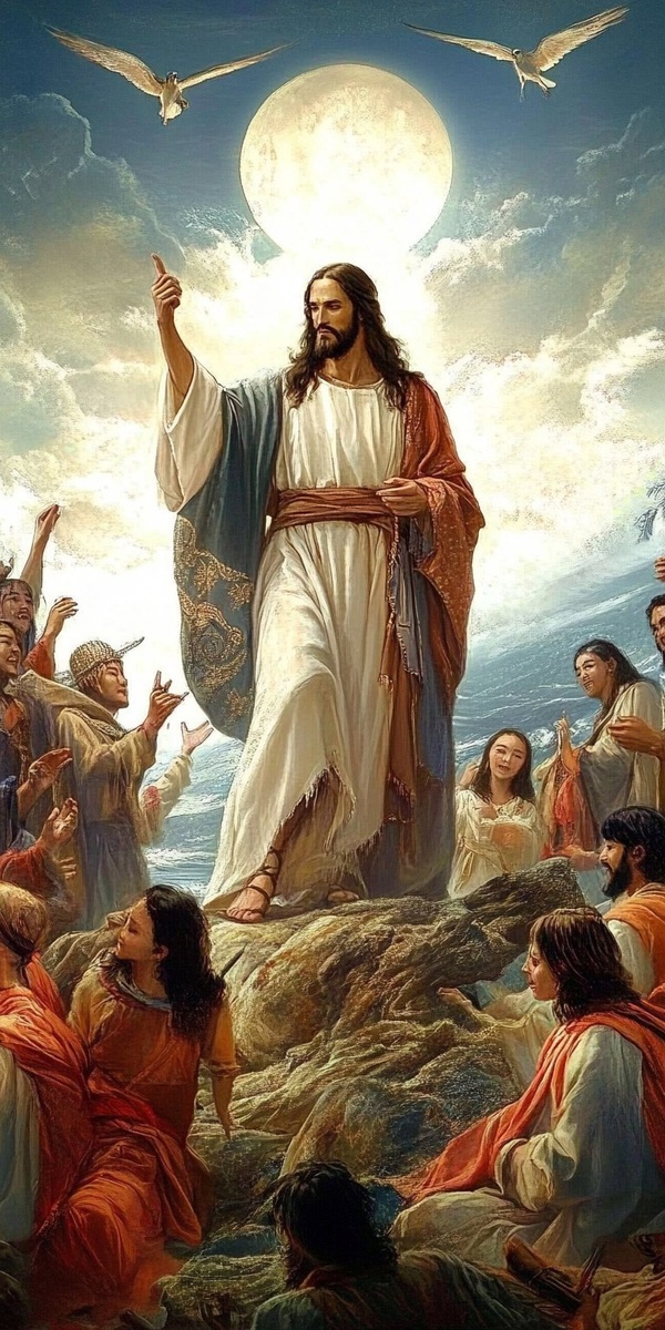 Автоперевод: Обновите этот образ, чтобы показать Иисусу, в окружении счастливых современных азиатско -тихоокеанских студентов и студентов -колледжей, одетых в одежду 20 -го века на Гавайском побережье, Иисус наставляет их