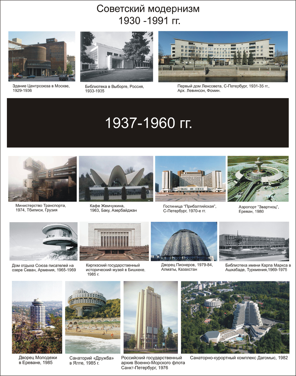 То что сегодня принято называть «советский модернизм» - это наверное не совсем верное понятие. То что мы видим, начиная с 1960-х гг. вплоть до 1990-х это больше напоминает монументальность нежели функционализм, интернационализм или региональные поднаправления модернизма, да и влияние монументального искусства которое было «коньком» СССР повлияло и на творчество зарубежных архитекторов того времени, единственное только монументальное искусство для капстран было дорогим удовольствием, для Советского Союза же – монументальные как в узком так и в широком смысле, проекты были привычной повсеместной практикой.