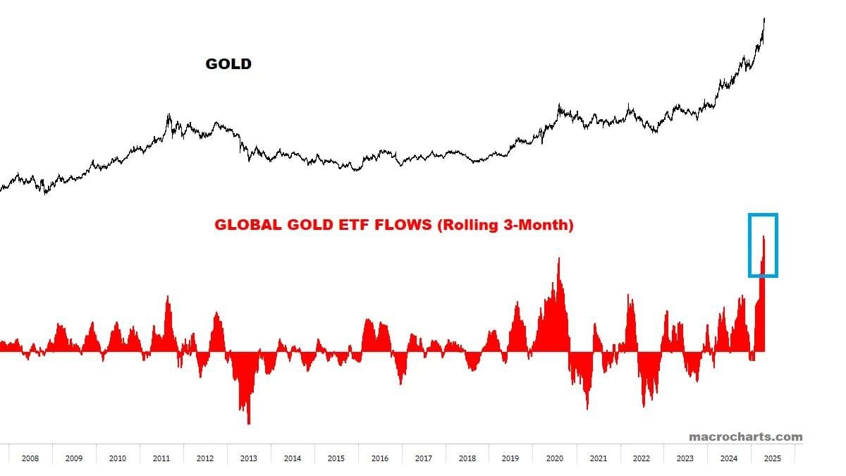 #SystemDollarCrash Бумажное #Золото — последний класс активов в рамках текущей долларовой системы, который должен продемонстрировать пик перед системным обвалом Прямо сейчас перекупленность этого актива [прокси = золотые ETF] достигла рекордных уровней, как и объем опционной торговли [сегодня увидели пик] В него успешно засадили практически ВСЕХ игроков @marketheart