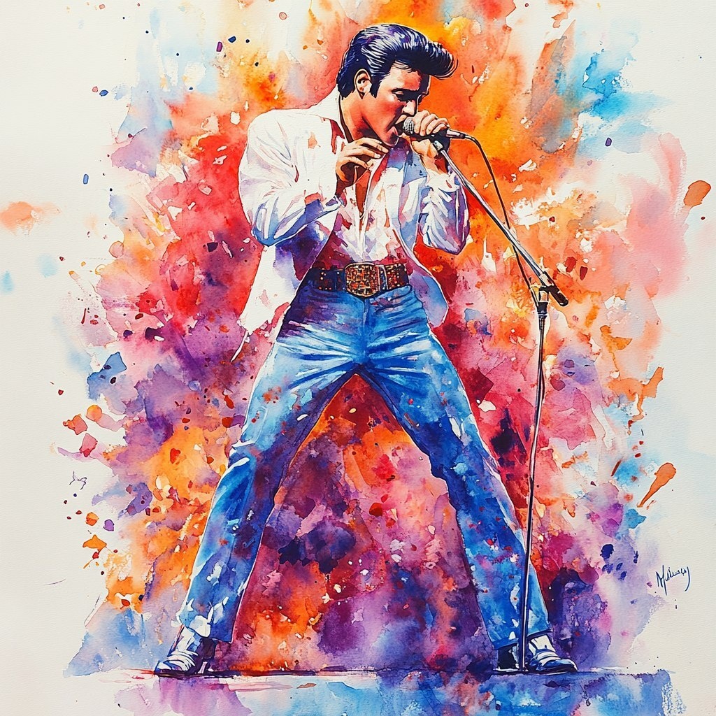 Создано на основе запроса: Watercolor painting of a young Elvis Presley in his iconic Jailhouse Rock pose, standing with legs wide apart