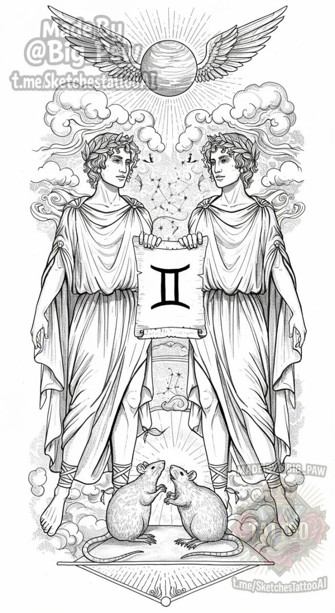 #2302 Подборка по запросу подписчика - Можно так же только близнецы в год крысы 🧠 SYNTX 💳 Донат 😎 НейроБро 💀 Эскизы от нейросети #близнецы #знакзодиака #крыса #эскизы #тату #татуировки