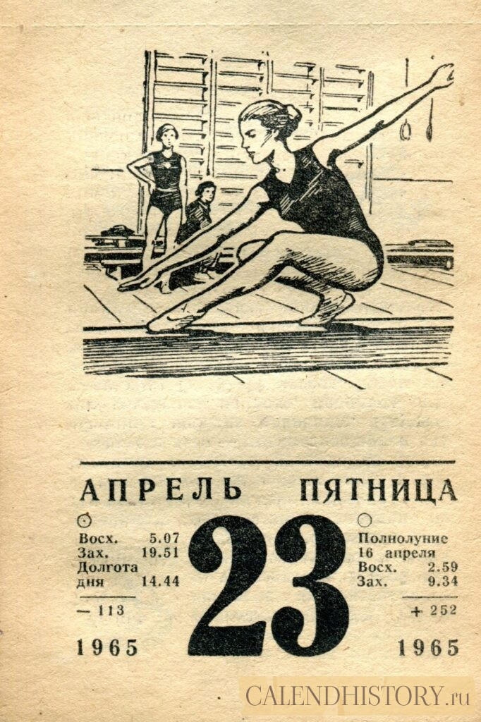 Итак, сегодня 23-го апреля и у нас на календаре 1965-й год. Перед нами листок советского календаря для женщин. На календаре у нас пятница - 23 апреля 1965-го года. *** Оборотную сторону листка этого календаря можно посмотреть у нас по ссылке на сайте. Заходите на наш интересный сайт об отрывных календарях. Другие листки советских календарей смотрите у нас на сайте - CALENDHISTORY.ru ПОСМОТРИТЕ ЕЩЁ ЛИСТКИ ОТРЫВНЫХ КАЛЕНДАРЕЙ: