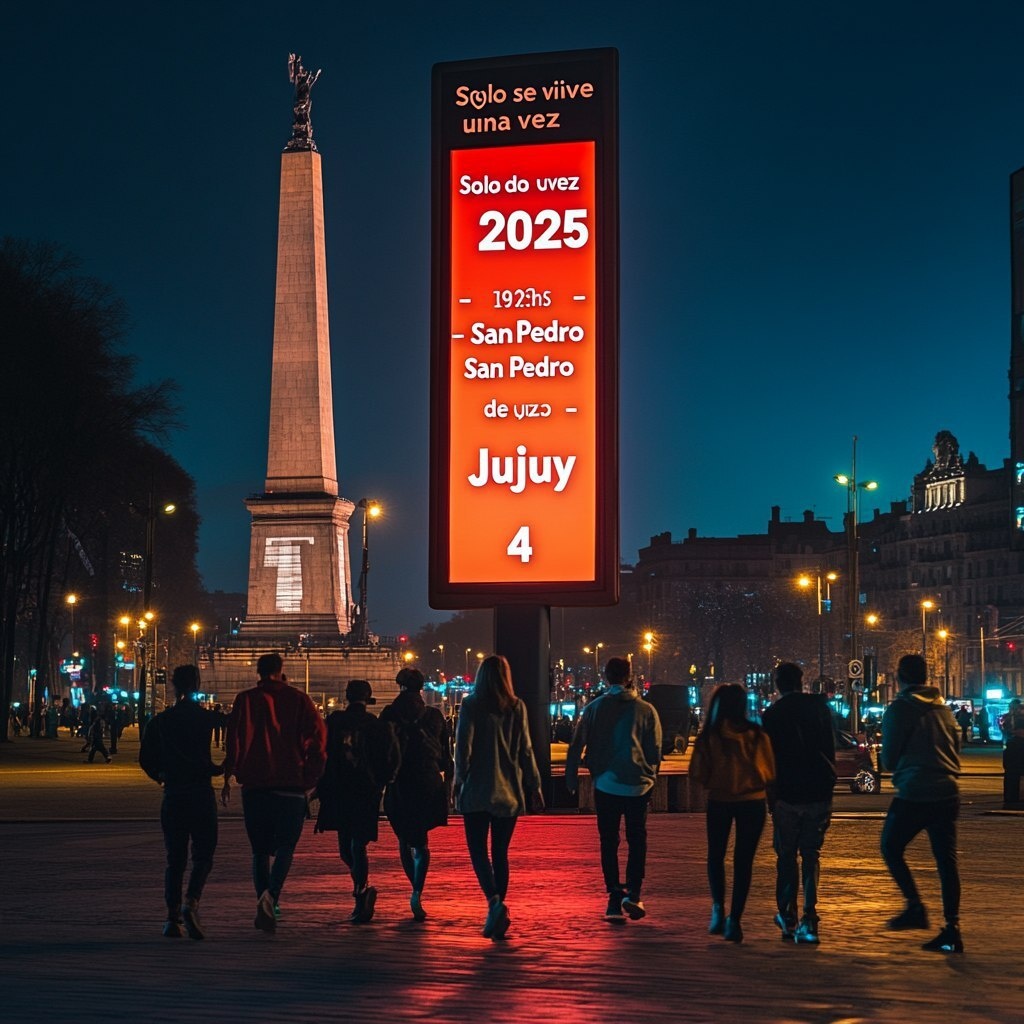 Создано на основе запроса: a hiperrealistic photo of a group of 14 friends walking having fun at the Obelisco in Buenos Aires. It's night and behind them there's a huge sign that says "Sólo se vive una vez 2025 - Sábado 19.30hs - San Pedro de Jujuy 4" --- Автоперевод: Хиперареалистическая фотография группы из 14 друзей, прогуливающихся в Обелиско в Буэнос -Айресе. Как тебе эта картинка? 🤔 https://dzen.ru/id/65c0c65c86e4f837c27b24d7 #ИИ #AI #нейросеть #midjourney #art