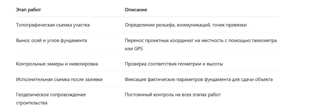 Автор: Кулешов Юрий, инженер-геодезист ООО «ГеоРусИзыскания» Геодезия фундамента — важнейший этап в процессе строительства, от которого напрямую зависит точность закладки основания здания. Ошибки в этом этапе могут привести к перекосу стен, трещинам, неравномерной усадке и даже разрушению конструкции. Особенно это актуально в Москве и Московской области, где плотная застройка, сложные геологические условия и высокие требования к качеству строительства. 👉 Геодезические работы на этапе закладки фундамента позволяют: Перед началом строительства фундамента необходимо провести комплекс инженерно-геодезических изысканий. Ниже представлена таблица с перечнем необходимых работ: Работы по геодезии фундамента включают в себя несколько ключевых этапов: Заказчик и инженер-геодезист совместно определяют цели, объемы и точки съемки. Производится выезд на участок с профессиональным оборудованием (тахеометры, лазерные нивелиры, GPS-приемники). Производится вынос точек фундамента в натуру. После закла
