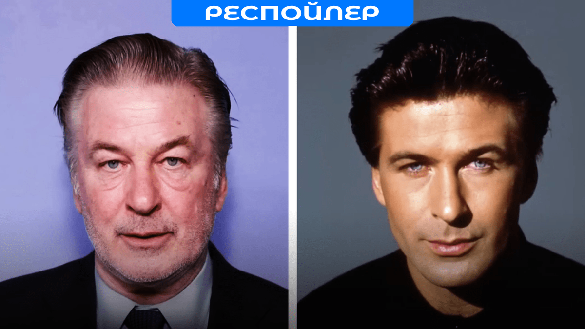 Слева – сегодняшний Болдуин, с более тяжелым взглядом, сединой, лицо человека, прошедшего через публичные штормы. Справа – тот самый молодой интеллектуал Джек Райан или пылкий любовник из 90-х.