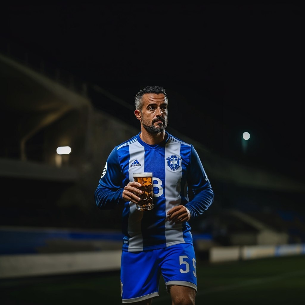 Создано на основе запроса: a elegant man 51 years old wearing PORTO soccer equipment and blue short, holding a beer