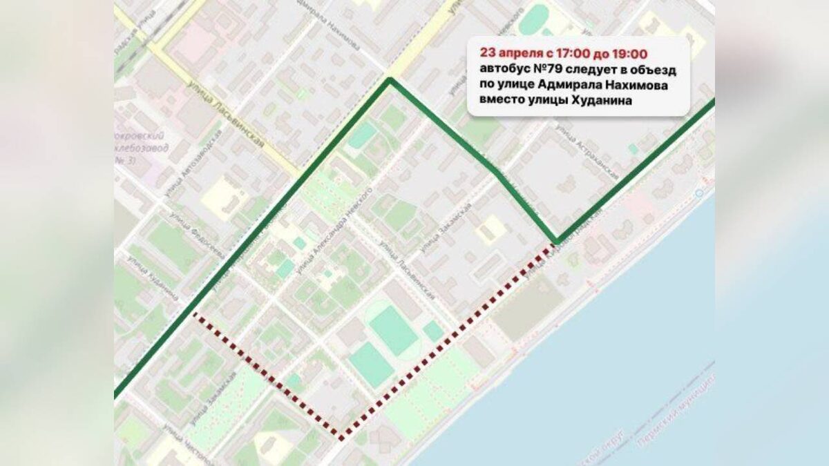 В Перми 23 апреля временно изменится маршрут автобуса №79 в Кировском районе. Изменения связаны с проведением эстафеты, приуроченной к 80-летию Победы в Великой Отечественной войне. С 17:00 до 19:00 транспорт будет объезжать перекрытый участок по улице Адмирала Нахимова вместо улицы Худанина. Пассажиров просят учитывать это при планировании своих поездок.