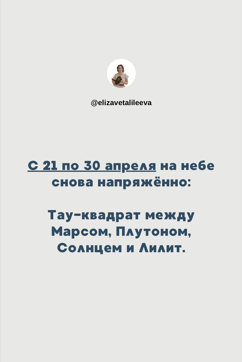 С 21 по 30 апреля на небе снова напряжённо: Тау-квадрат между Марсом, Плутоном, Солнцем и Лилит 🌒 ➡️ Марс во Льве — серьёзный, горделивый, агрессивный, надменный; энергии в нём море. ➡️ Плутон обживается в новом для него знаке Водолея. ➡️ Лилит в Скорпионе — коварная, мощная, скрытая, магическая. ➡️ Солнце в Тельце — прекрасное, созидающее! Много агрессивной энергии, что влияет как на личные, так и на общественные процессы. Травмы, операции, обострение болезней. Аварии — стоит быть осторожнее за рулём. Не удивляйтесь, если будет много агрессии внутри; захочется поссориться, поругаться, подраться. Это с одной стороны, а с другой — это всё мощные энергии для созидания. Чего? Своей жизни. В том числе для повышения дохода и улучшения качества своей материальной жизни! Встаёт вопрос: как? Здесь потребуется знание своей кармической задачи! Понимать, куда можно направлять свою мощную энергию конструктивно, на созидание, чтобы она не перешла в разрушающую всё и вся агрессию! Общее