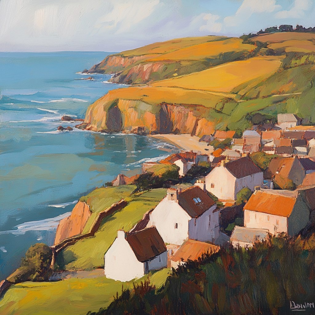 Создано на основе запроса: lori Putnam plein air style looking down on English coastal village, ocean and headlands