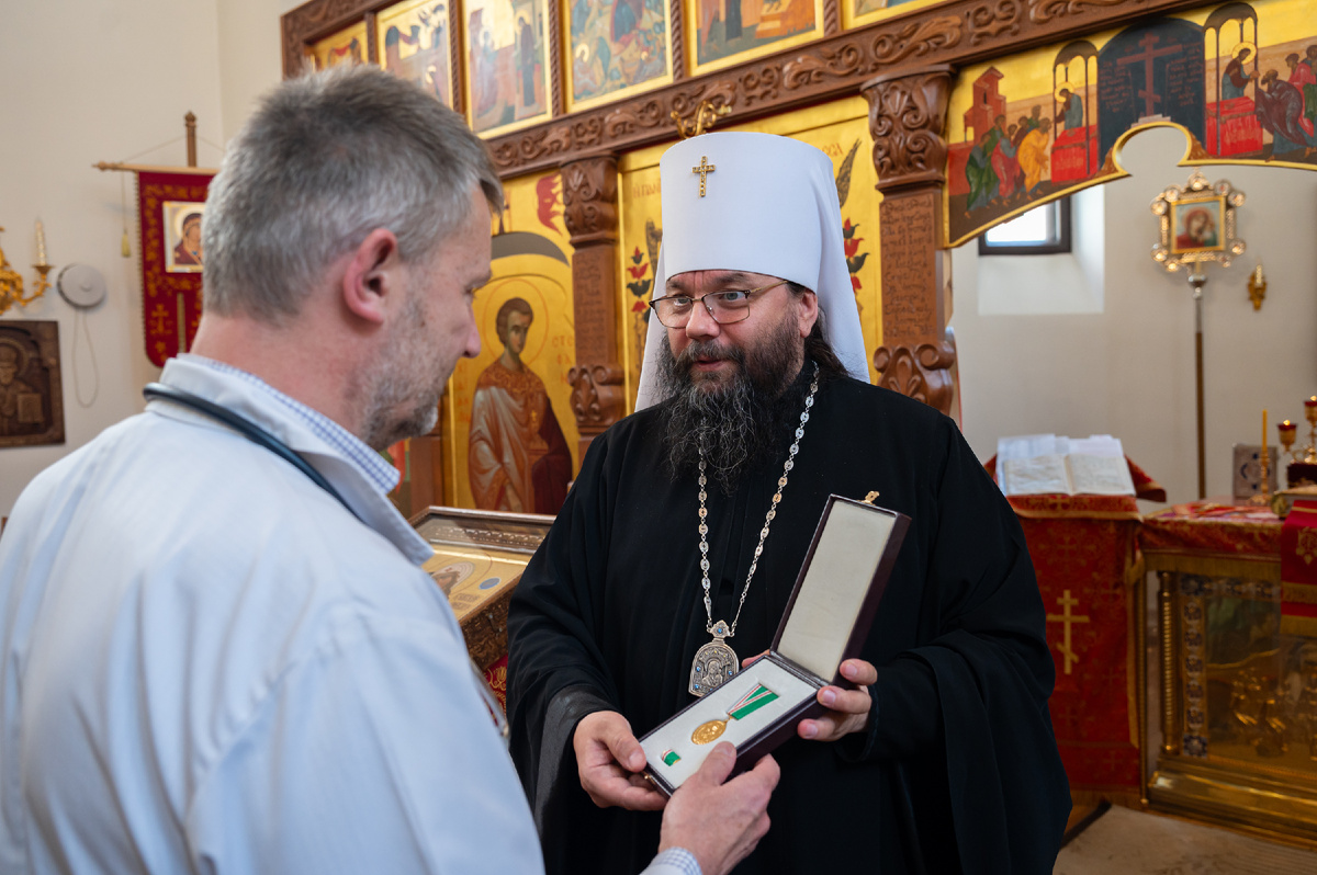 В храме, по благословению Святейшего Патриарха Московского и всея Руси Кирилла, митрополит Матфей вручил медаль “Патриаршая благодарность” заместителю главного врача Псковского филиала ПОКБ по лечебной части Борису Андрееву.
