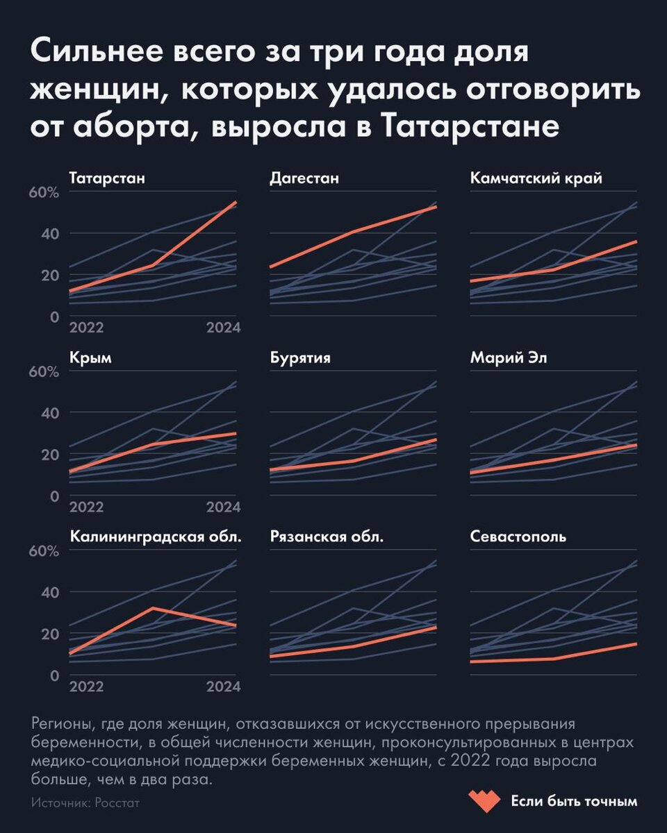 В 2024 году почти каждую четвертую женщину отговорили от абортов после медицинских консультаций. Это следует из данных Минздрава, на которые обратил внимание «Если быть точным». Чаще всего женщин от абортов удается отговорить в Чечне и Кабардино-Балкарии — 100 и 97,7% соответственно. А реже всего в Тыве (7,4%), Еврейской автономной области (7,2%) и Калужской области (6%). К этим данным стоит относиться с осторожностью: сильный разброс по регионам может указывать на манипуляции. Совсем не отговаривают от абортов в Ингушетии: этого региона даже нет в статистике. Как пояснили «Если быть точным» в Минздраве, в республике нет специальных центров, поскольку доля абортов там минимальна. Что изменилось за последние годы На Федстате доступны данные по доабортному консультированию только за 2024 год. Однако в распоряжении «Если быть точным» есть более подробная статистика, начиная с 2022-го — именно тогда этот показатель начали отслеживать отдельно. С 2022 года доля женщин, которых удалось отго