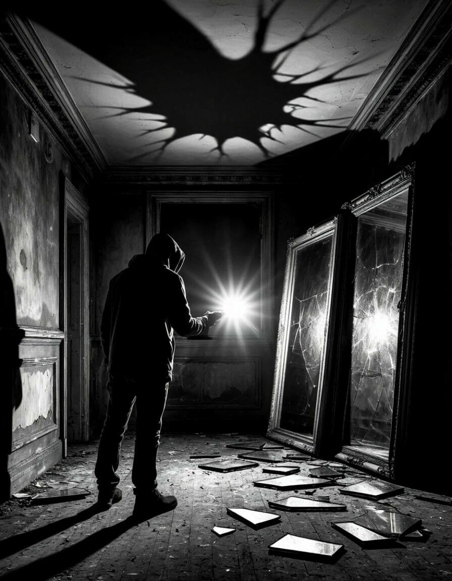 🪞 Эдик встал, ноги ватные. Луч фонарика упал на потолок — там двигалось пятно, тёмное, бесформенное, словно тень без хозяина. Зеркало в углу треснуло с хрустом, осколки осыпались, и в каждом блестели те же белёсые глаза... (цитата из 2️⃣ главы) . 📖 Призрачные грани восприятия https://author.today/work/440627